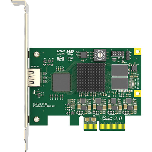 The Pro Capture HDMI 4K Capture Card from Magewell is a low-profile PCIe x4 card that allows for capturing a single channel of HDMI + embedded audio. The card supports extraction of audio formation information and channel status data, video timing information, 3D format information, and Sony/Canon DSLR timecode. The card is also capable of performing various video processing features, including cropping, scaling, deinterlacing, aspect ratio conversion, color format conversion, video frame rate conversion, and video OSD composition.