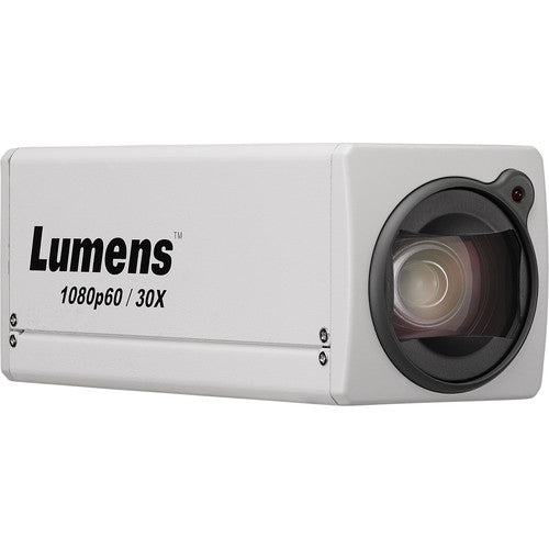The white 1080p Box Camera with 30x Optical Zoom from Lumens is a professional-level HD box camera with a 1/2.5" 8.57MP CMOS sensor that produces crystal clear pictures, even in very dark conditions. Users have full control over aperture, white balance, and exposure settings to deliver the images and colors your production requires. WDR (Wide Dynamic Range) and 3D noise reduction provide superior performance in high-contrast environments and where lighting is variable.